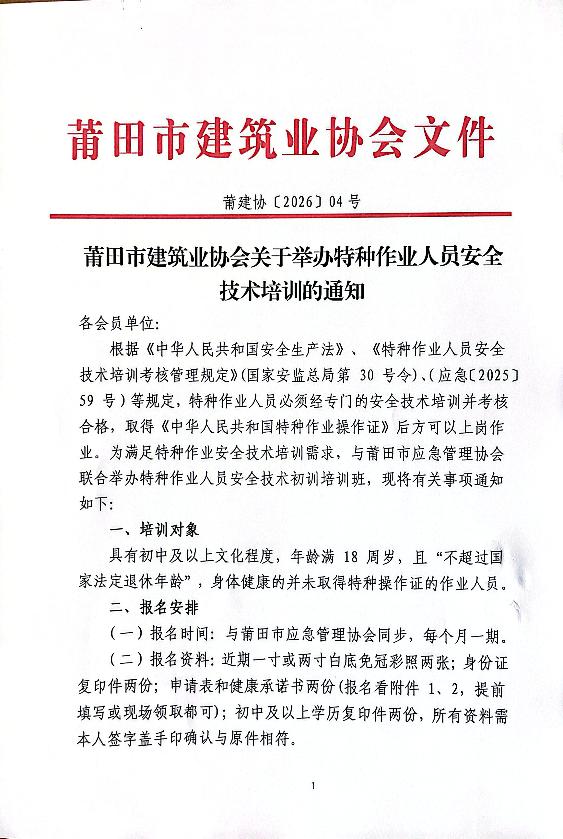 莆田市建筑业协会关于举办特种作业人员安全技术培训的通知